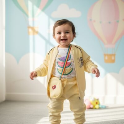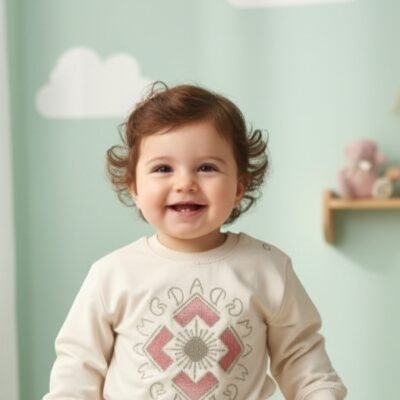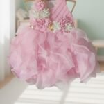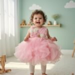This charming pink party dress is perfect for your little one’s special occasion. The dress features a beautifully ruffled skirt with multiple layers of soft tulle, creating a voluminous and playful look. The bodice is adorned with delicate, handcrafted floral appliques in shades of pink and white, accented with shimmering gold details. Made from comfortable and breathable fabric, this dress ensures your baby girl can move and play with ease. It’s an ideal choice for birthdays, photoshoots, or any festive event where she can be the star.